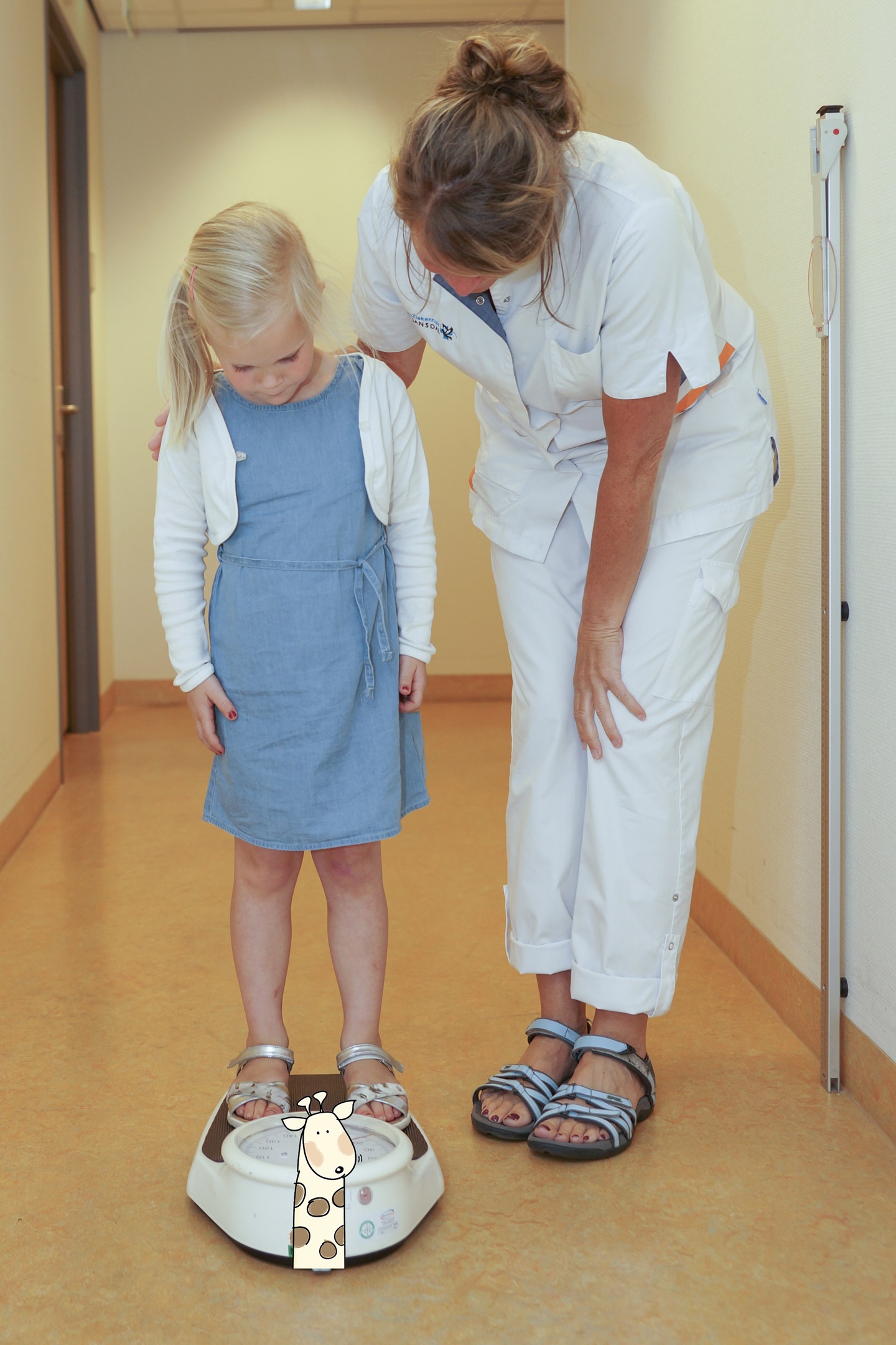 De assistente kijkt hoe groot ik ben.