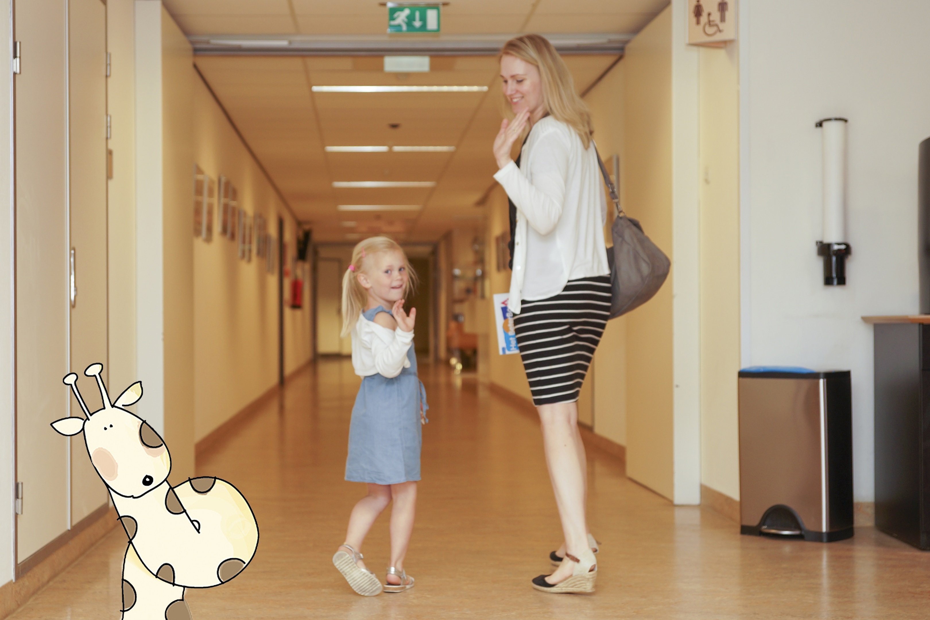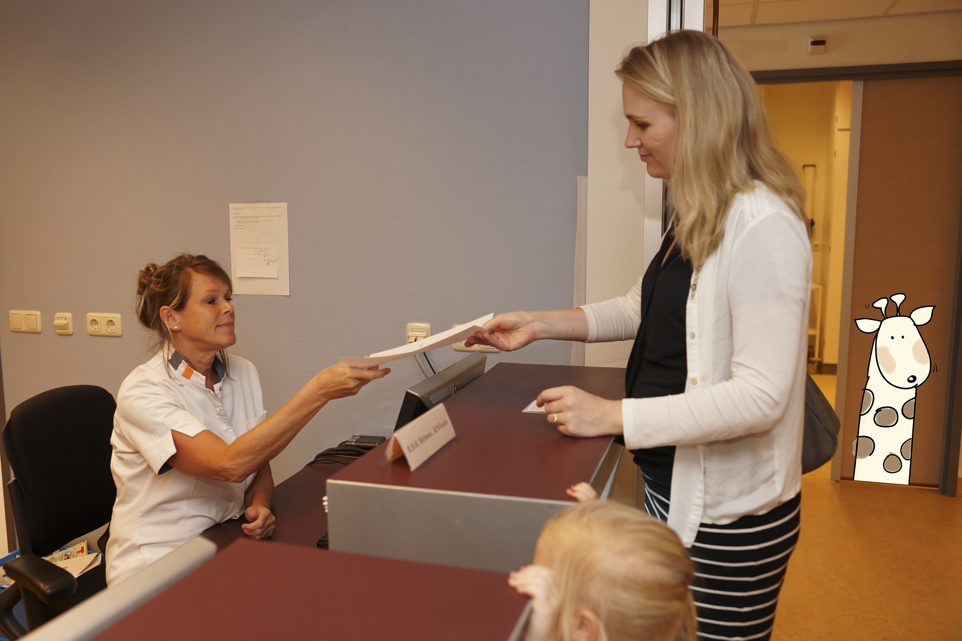 We zijn aangekomen bij de poli KNO. Mama geeft informatie over mij, zoals mijn gewicht en lengte. Dit heeft ze van te voren gedaan via MijnStJansdal, of ze vult het in de wachtkamer even in.