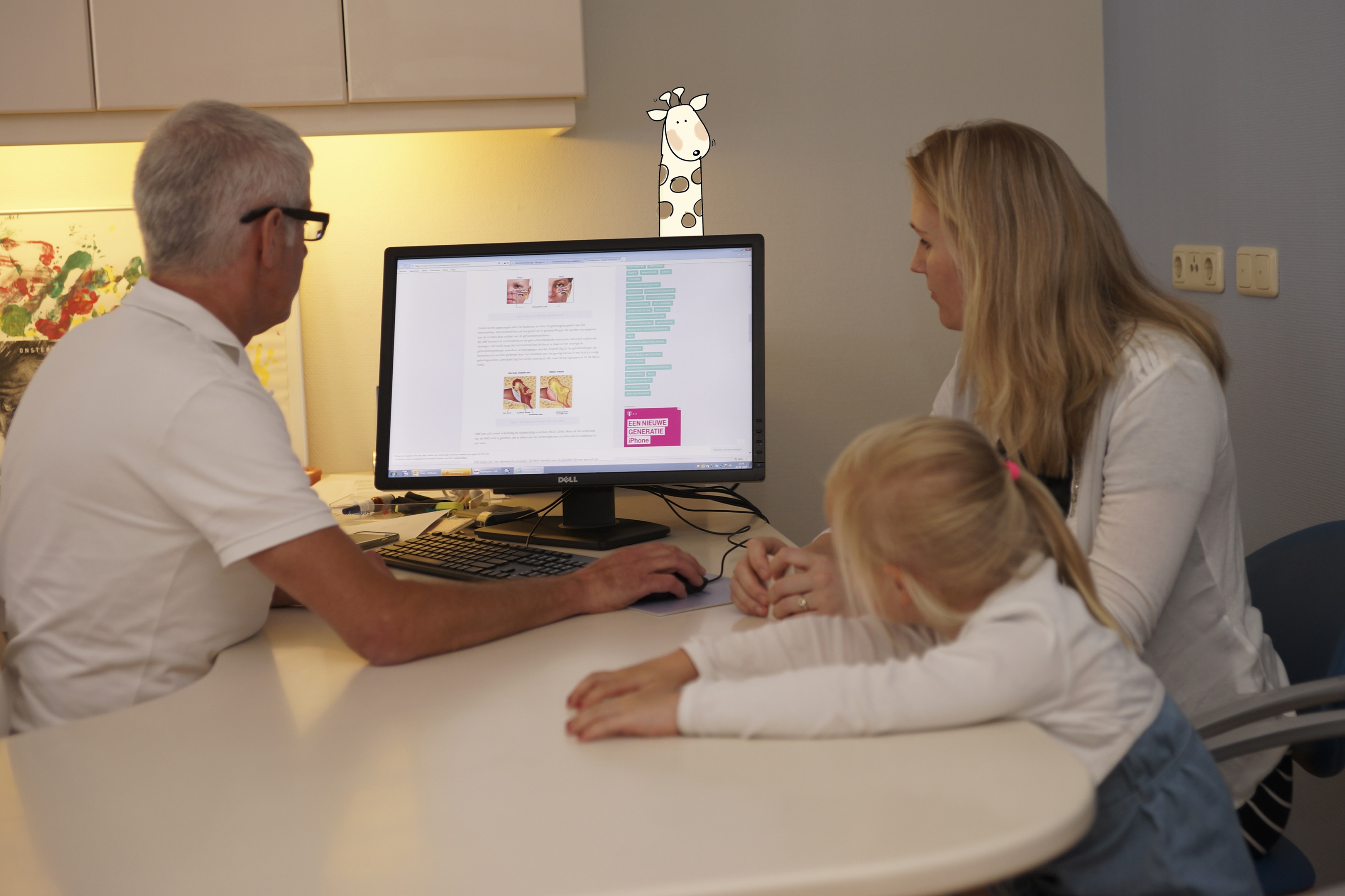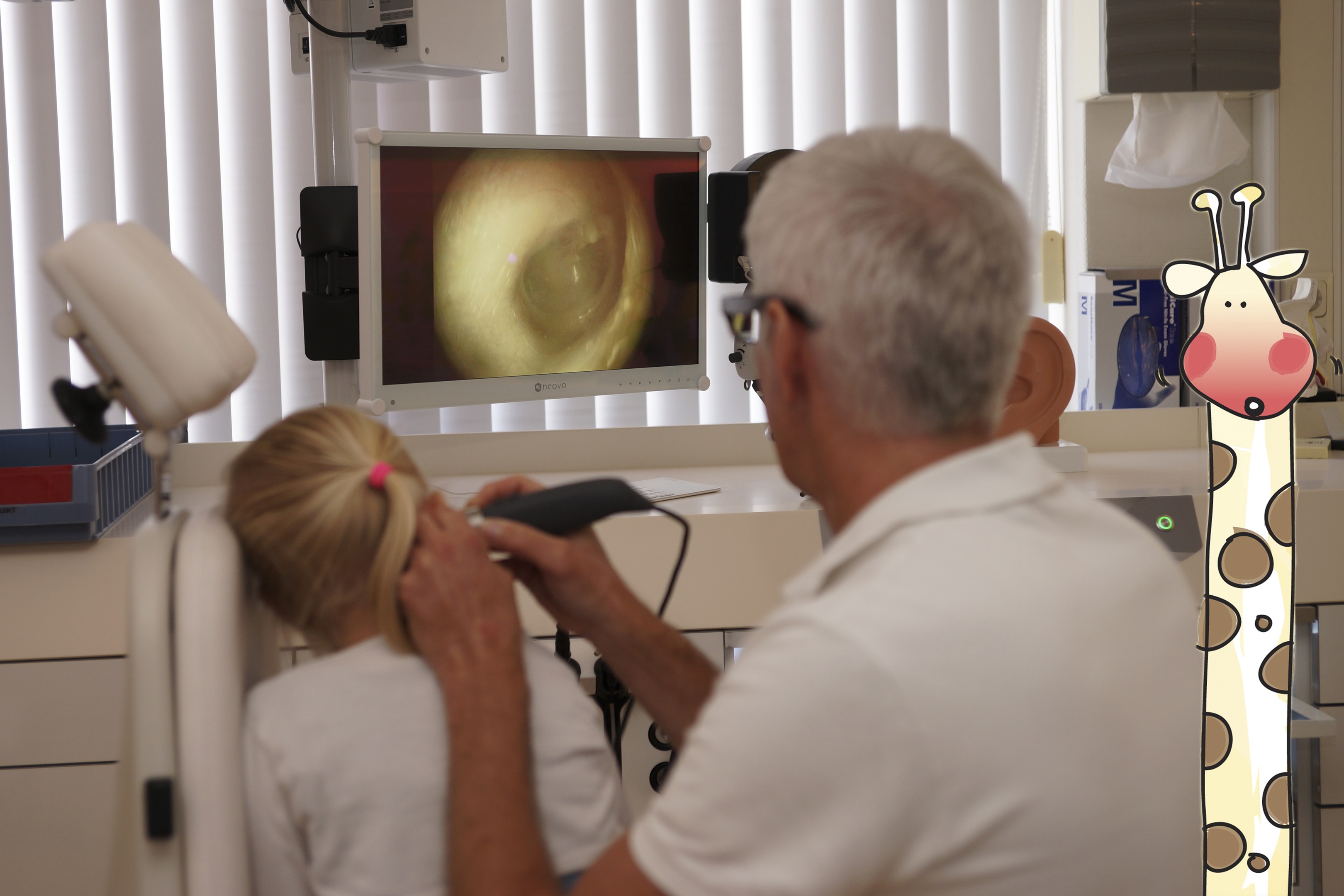 Ik mag op de stoel klimmen. De dokter kijkt in mijn oren en/of keel met een apparaatje. Zie je je oor op het scherm?
